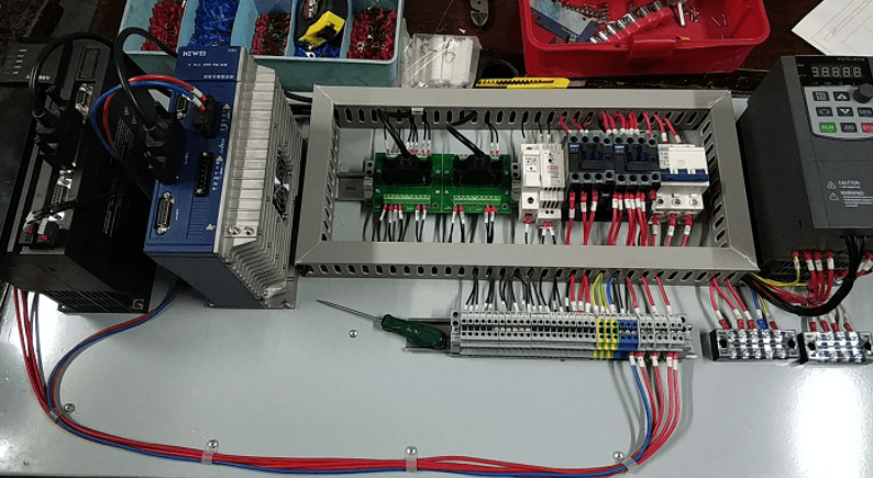 根据客户工艺要求,搭建控制系统、并进行编程、组态,是自动化公司的日常工作。常规控制系统由PLC(控制板、控制器)、伺服(变频器)、触摸屏构成。如下图: