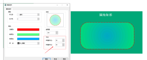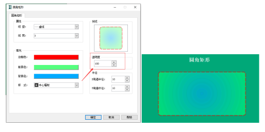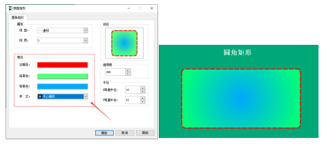 例:圆角矩形的边框色设置为红色,前景色设置为绿色,背景色为蓝色,样式为中心辐射,如下图所示: