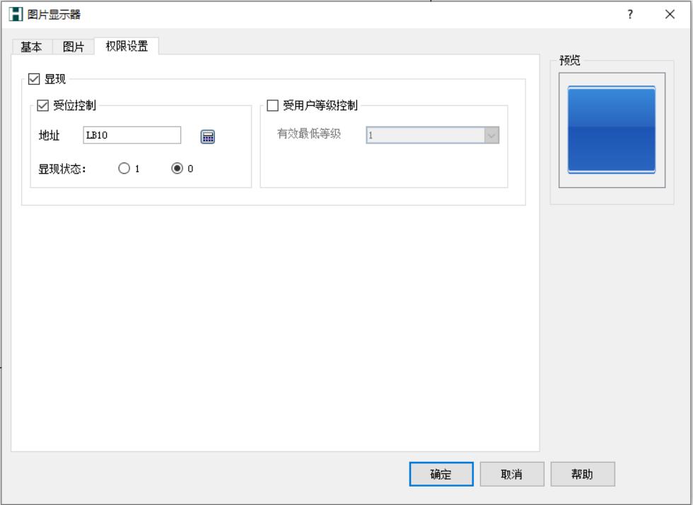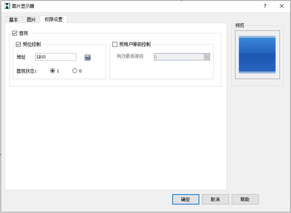 例如:在画面上建一个开关位按钮和一个图片显示器,控件显现受位控制,地址为LB10,显现状态为1,如图