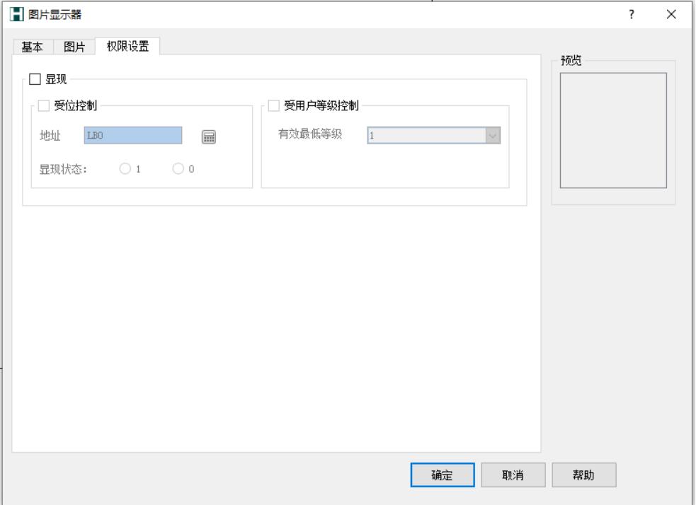例如:在画面上建一个开关位按钮和一个图片显示器,控件显现受位控制,地址为LB10,显现状态为0,如图